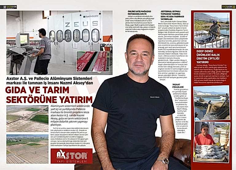 Aydın’da iş hayatının nabzını tutan Sektör Aydın Dergisi 4. sayısında şirket sahibimiz Sayın Nazmi Aksoy’u konuk etti. Yapılan röportajda Axstor A.Ş. bünyesinde gerçekleştirdiği projelerinden bahseden Sayın Aksoy; Aydın ili ve Türkiye ekonomisine katkıda bulunacak farklı sektörlerdeki bir çok önemli proje ve yatırımları hakkında bilgi verdi.